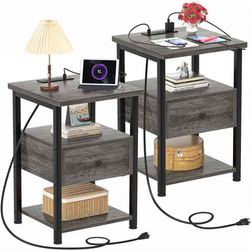 厂家货源卧室床头柜带USB插座和抽屉储物架适于客厅沙发边桌置物