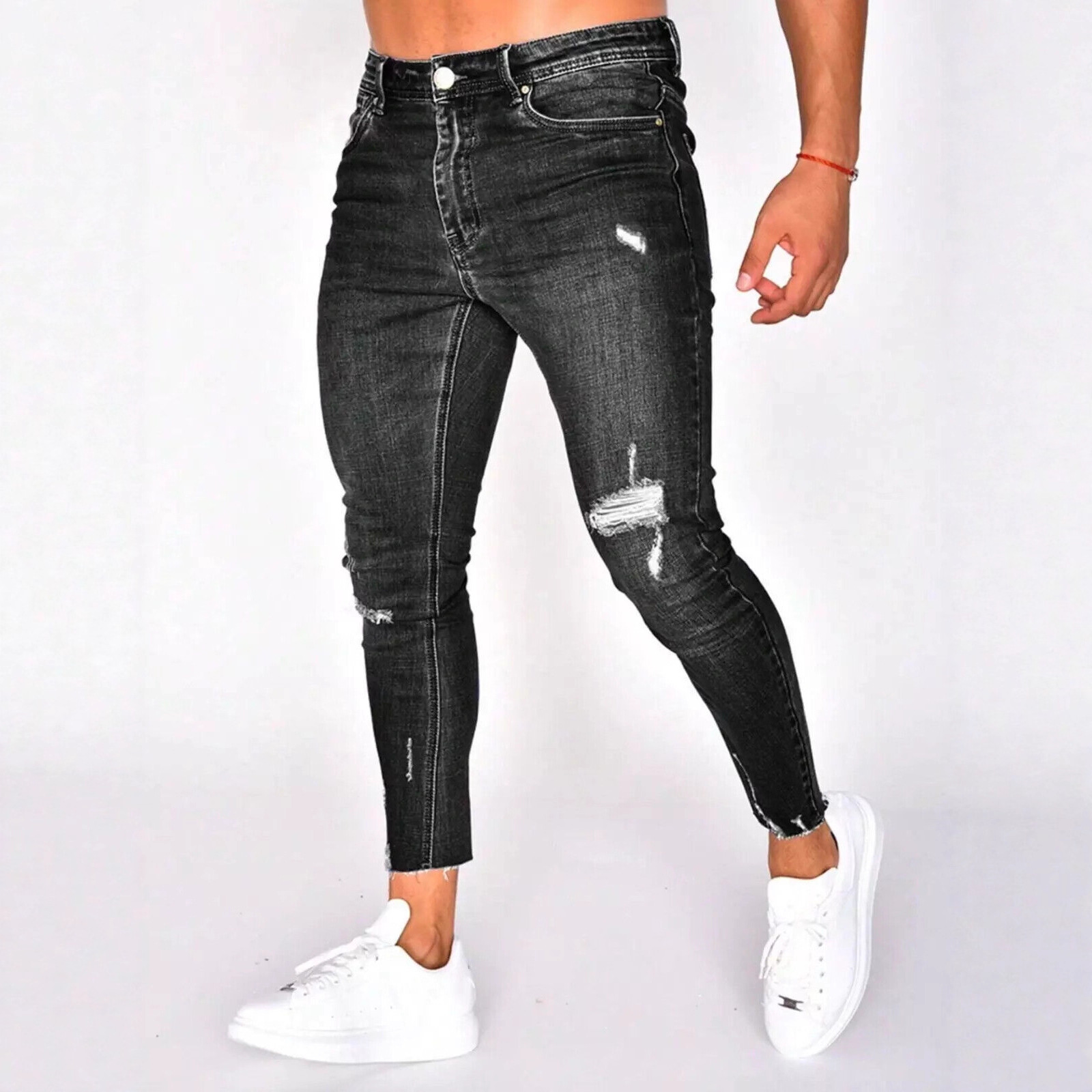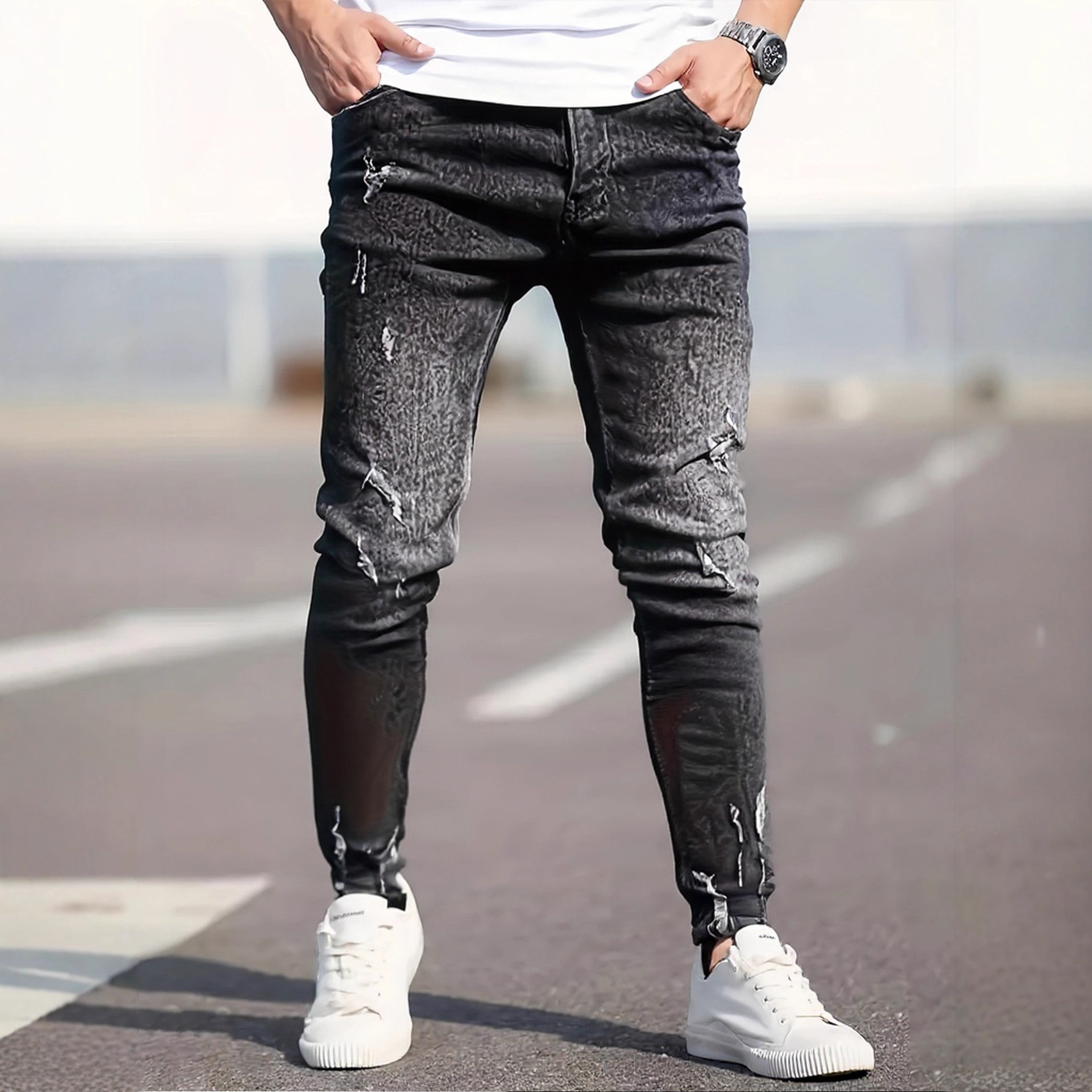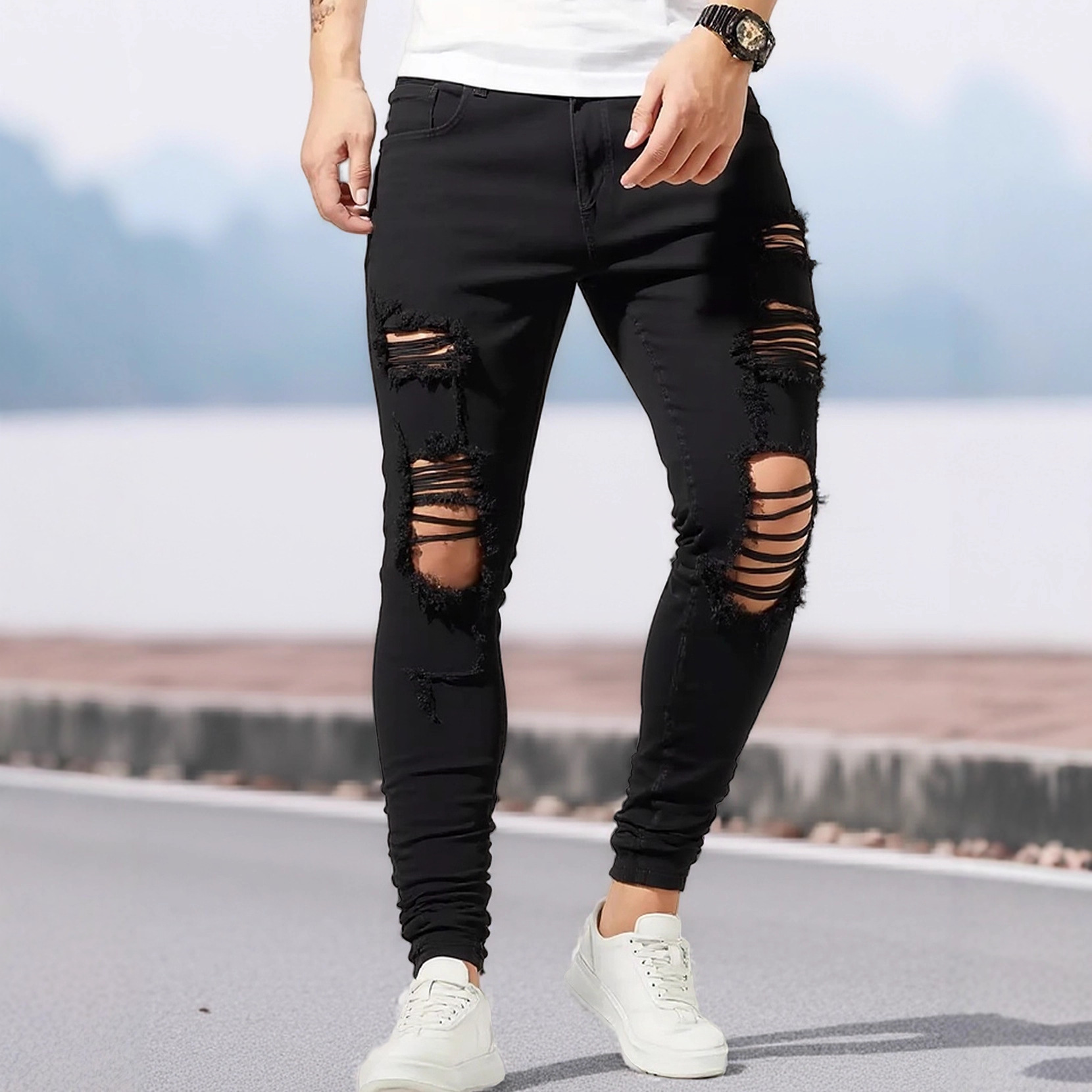 欧美跨境亚马逊高街破洞黑色修身小脚牛仔裤紧身型磨破高腰长裤男