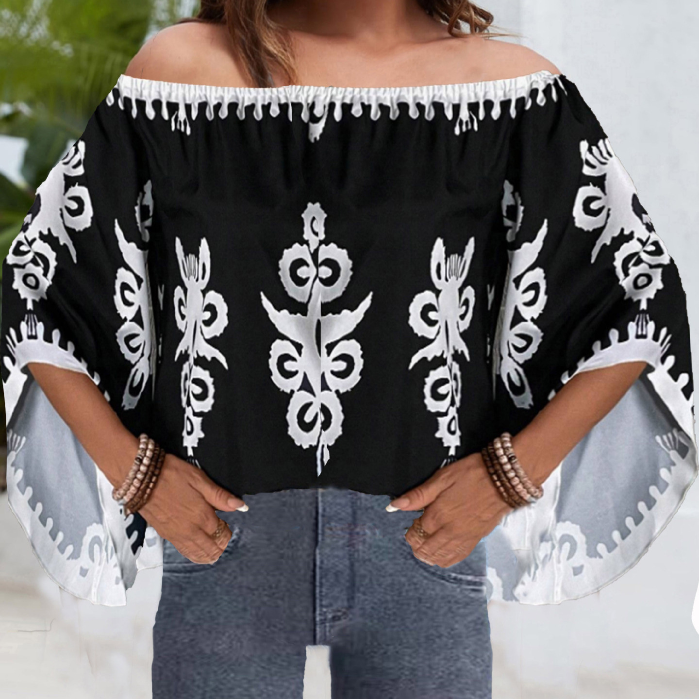 现货欧美跨境印花露肩不规则长袖T