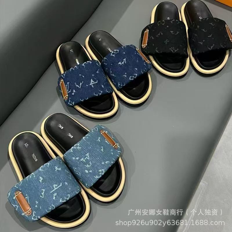 厚底魔术贴拖鞋女2024新款L家外穿时尚防滑牛仔布字母一字拖