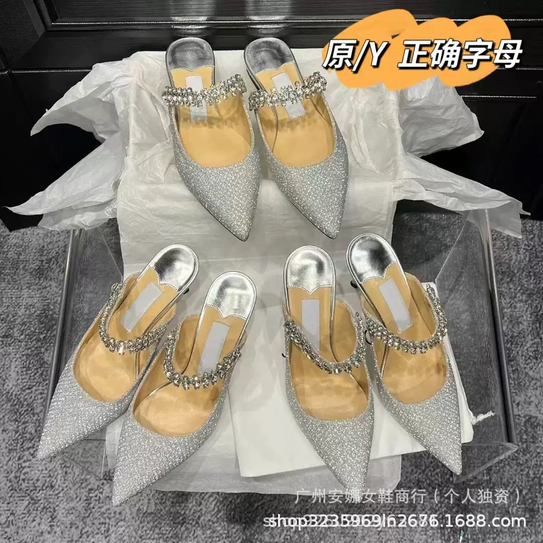 高版本尖头高跟凉拖鞋2024新款一字带拖鞋链条凉鞋包头穆勒半拖鞋