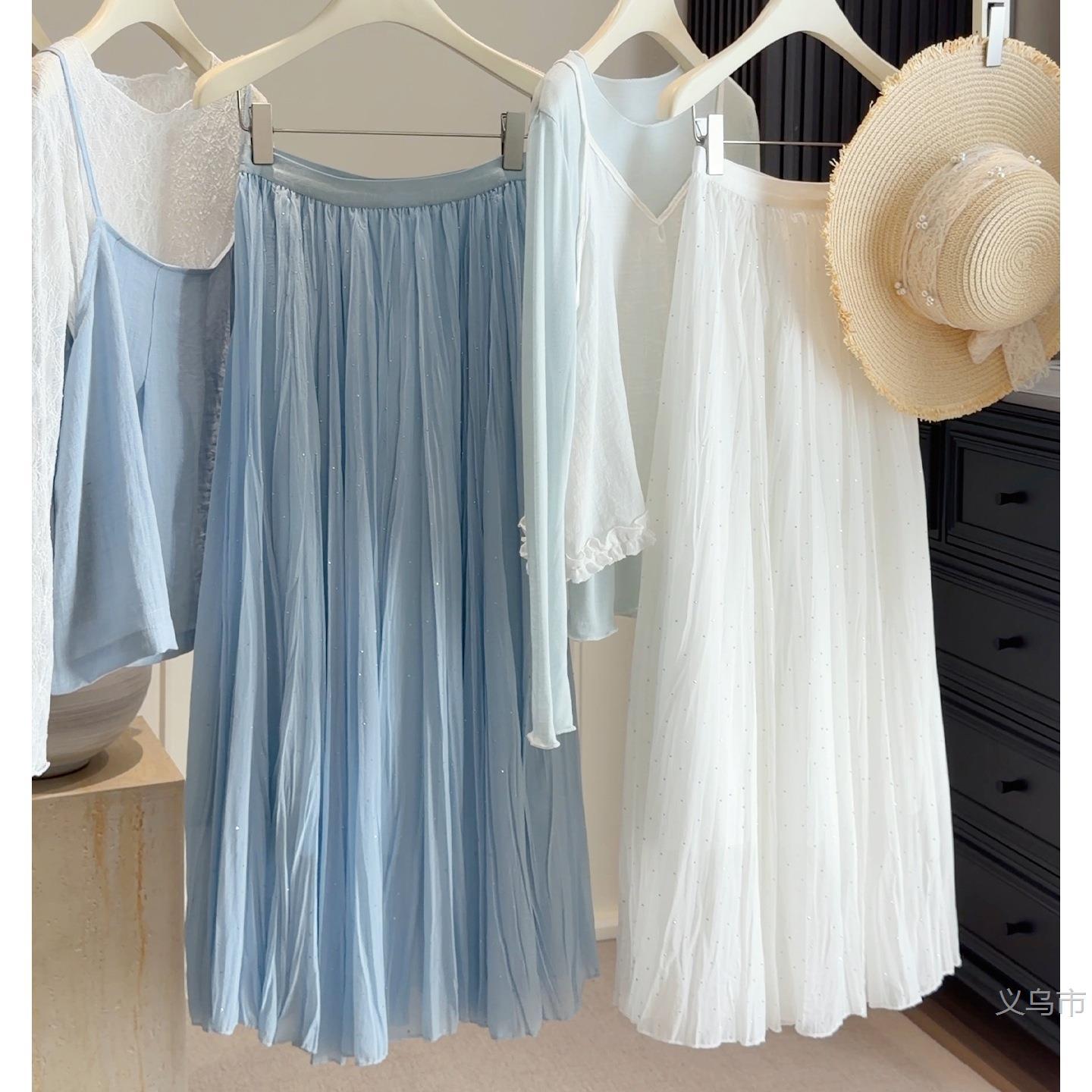 韩系纯色褶皱烫钻网纱半身裙女春季新款超仙显瘦百褶裙大2026雅晴