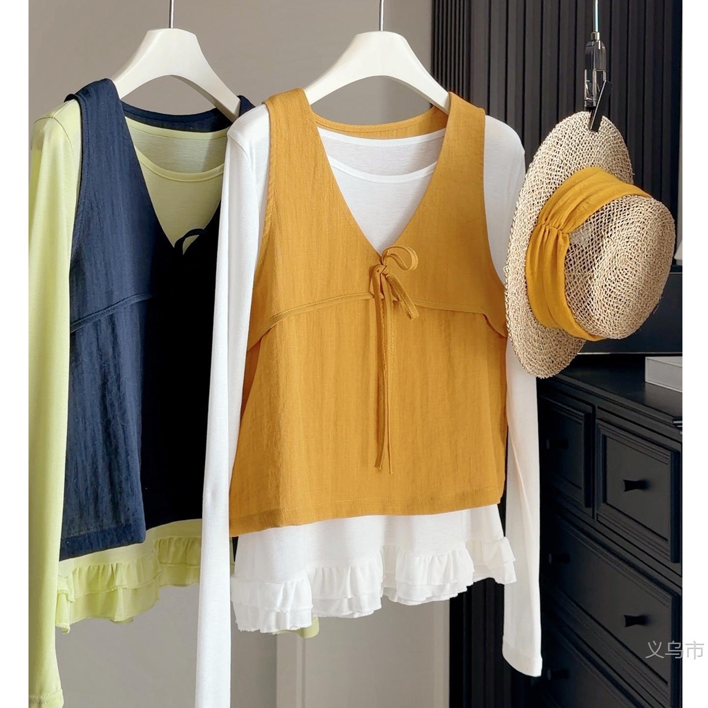 韩版绑带棉麻马甲背心女叠穿长袖打底T恤衫2026春新款时2026雅晴