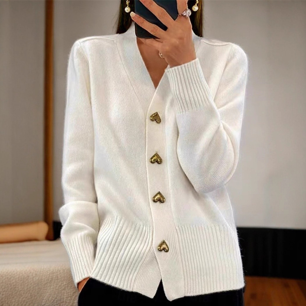 2025秋冬新款女士V领休闲气质宽松纯色针织内搭毛衣开衫爱心纽扣