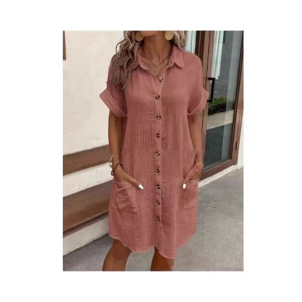 2025亚马逊欧美跨境休闲纯色棉麻排扣中长款短袖宽松连衣裙女装