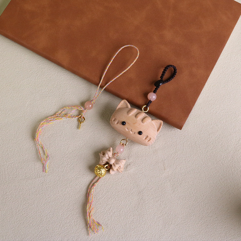 榉木雕刻法棍猫头蝴蝶结手机链挂件铃铛钥匙扣挂件车载挂件