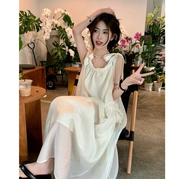 绑带挂脖连衣裙仙女夏季度假风休闲裙子慵懒风气质露肩无袖长裙
