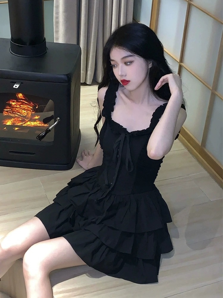 赫本风黑色木耳边吊带连衣裙夏季性感小个子绑带收腰荷叶边蛋糕裙
