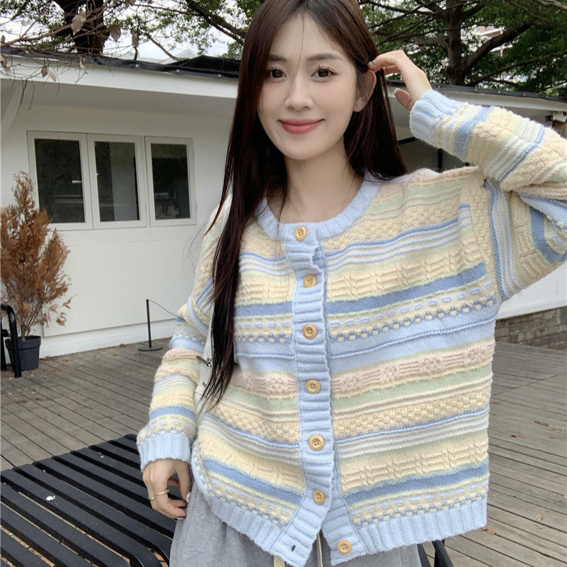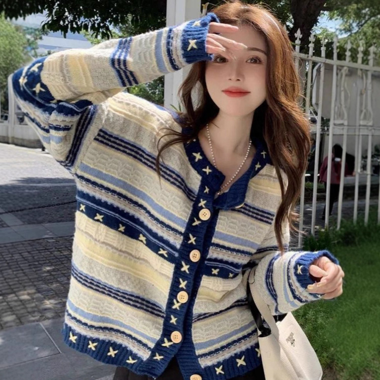 条纹毛衣外套女秋冬冬薄款针织开衫网红新款宽松外穿百搭长袖上衣