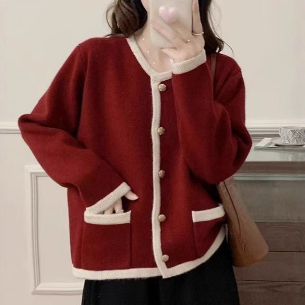 镶边撞色圆领单排扣简约气质针织开衫女春秋新款韩版减龄毛衣外套