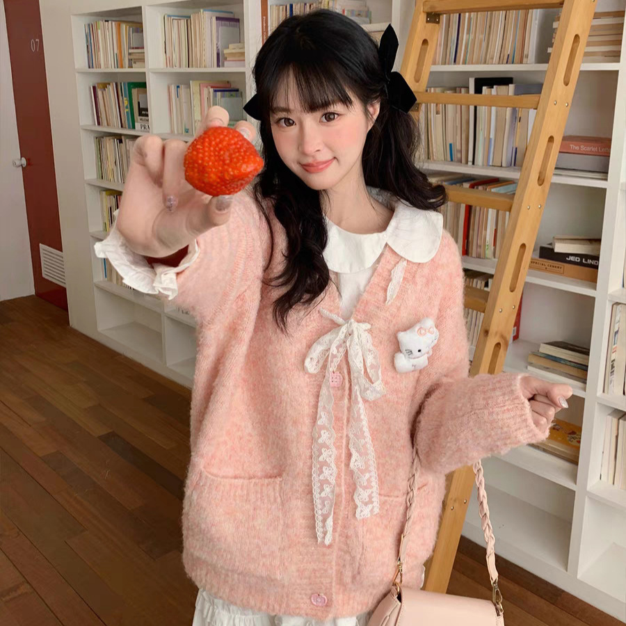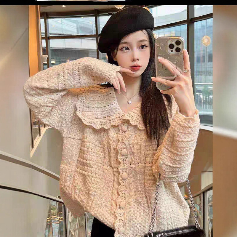 秋冬新款韩版宽松显瘦镂空花边娃娃领针织开衫甜美风百搭毛衣外套