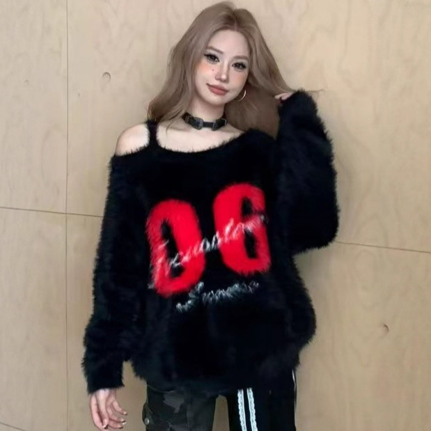 美式辣妹2025新款秋冬水貂绒毛衣女宽松外穿斜肩慵懒风针织衫上衣