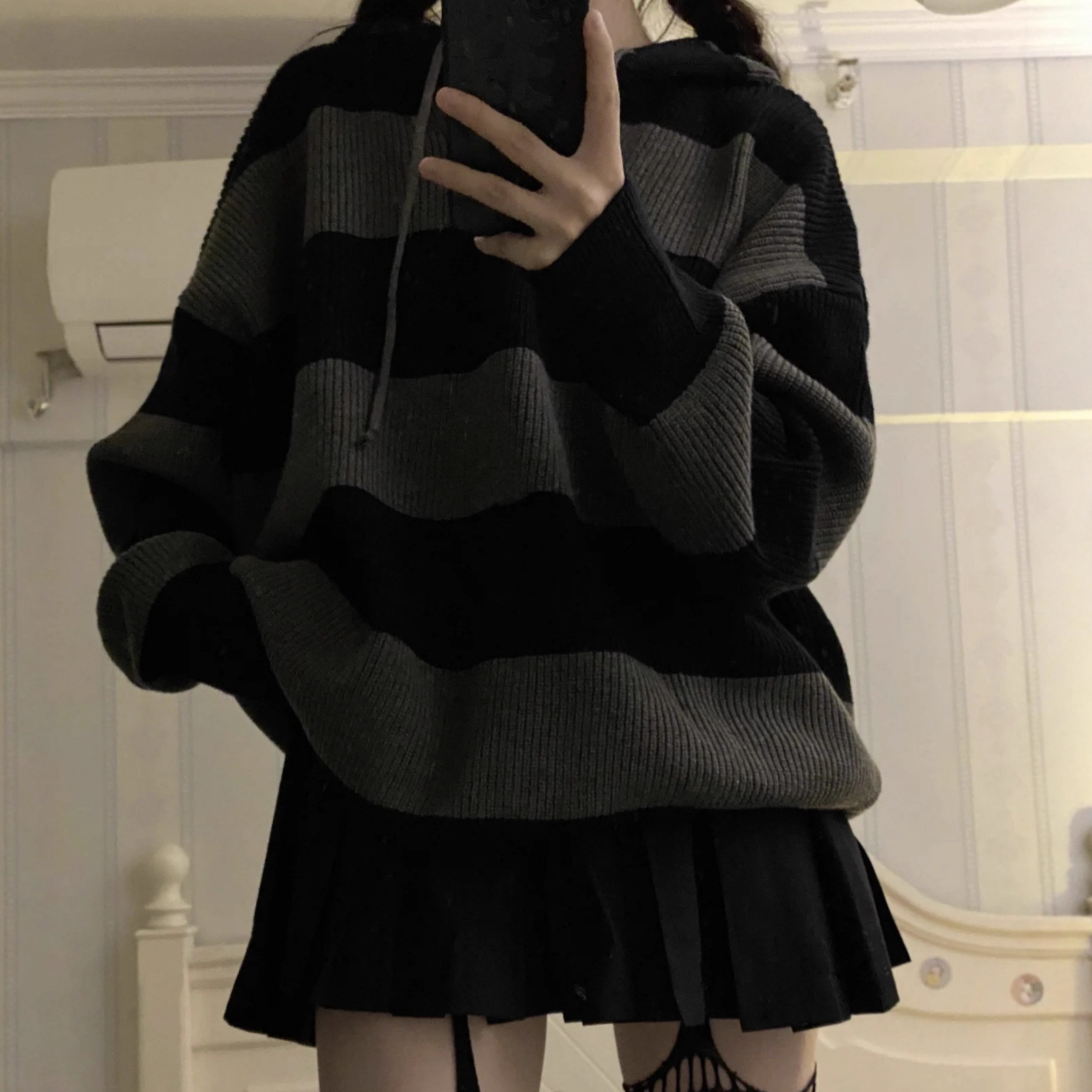 秋冬穿搭两件套连帽条纹毛衣小个子针织衫百褶裙慵懒风时尚套装女