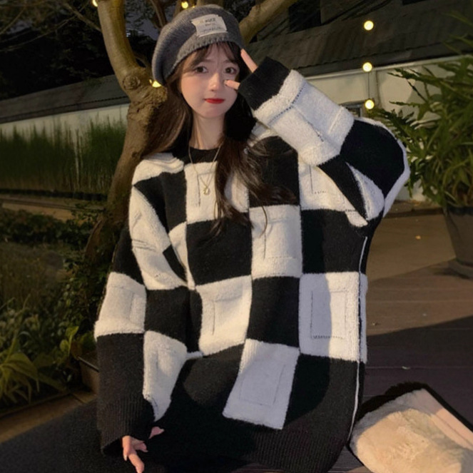 复古棋盘格子毛衣女秋冬季加厚外穿宽松慵懒风套头圆领针织衫上衣