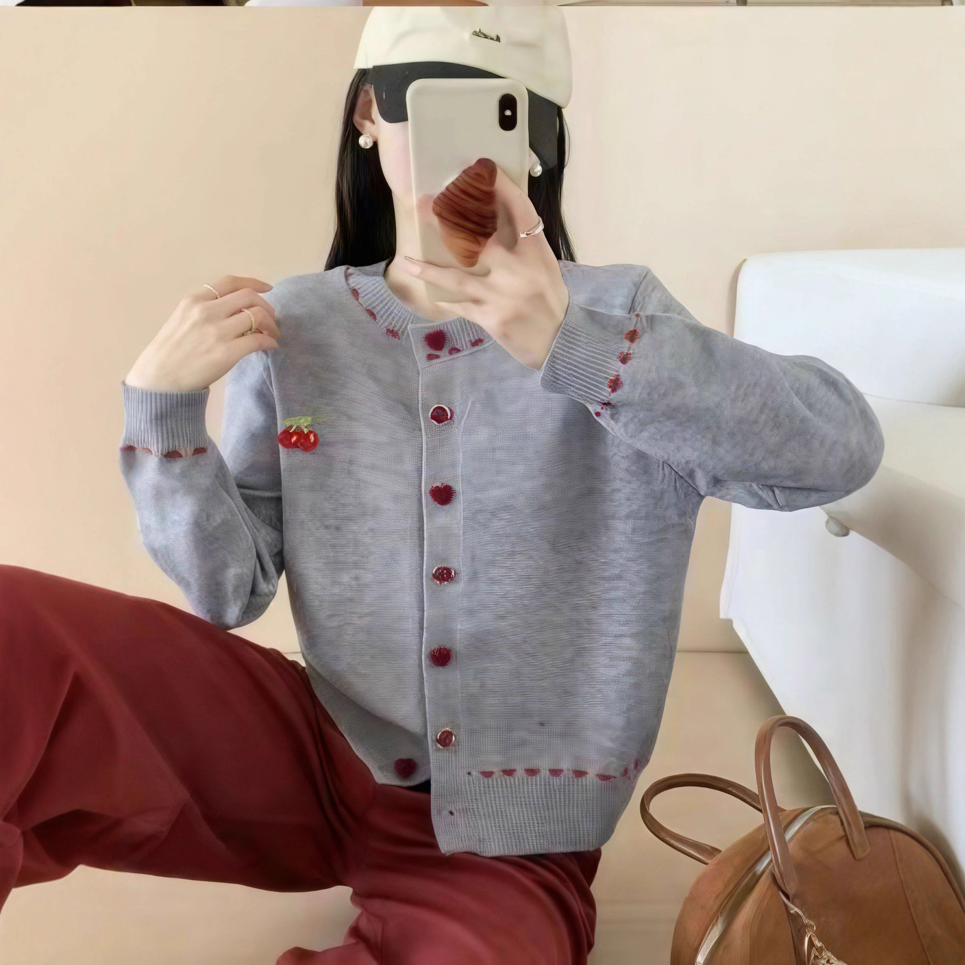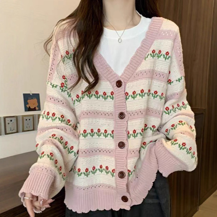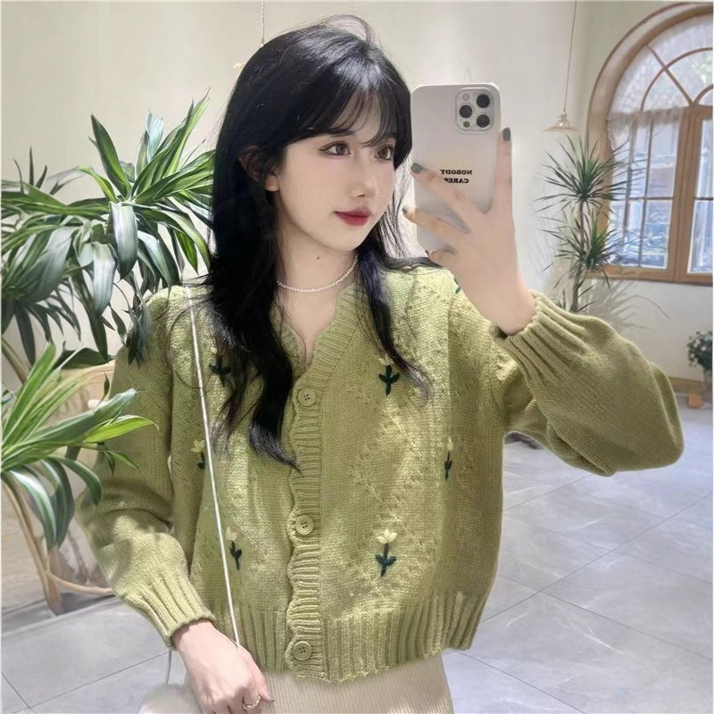 日系刺绣针织毛衣女2025秋冬新款花朵清新可爱 V领宽松开衫外套
