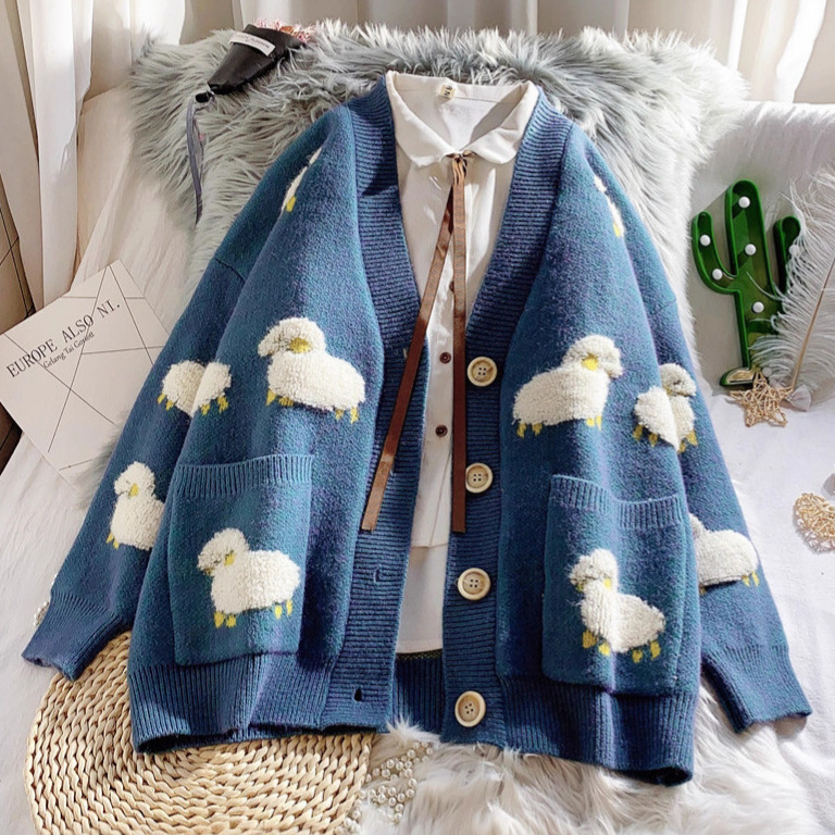 跨境外贸毛衣女秋冬小绵羊宽松外穿韩版慵懒风针织开衫女外套批发