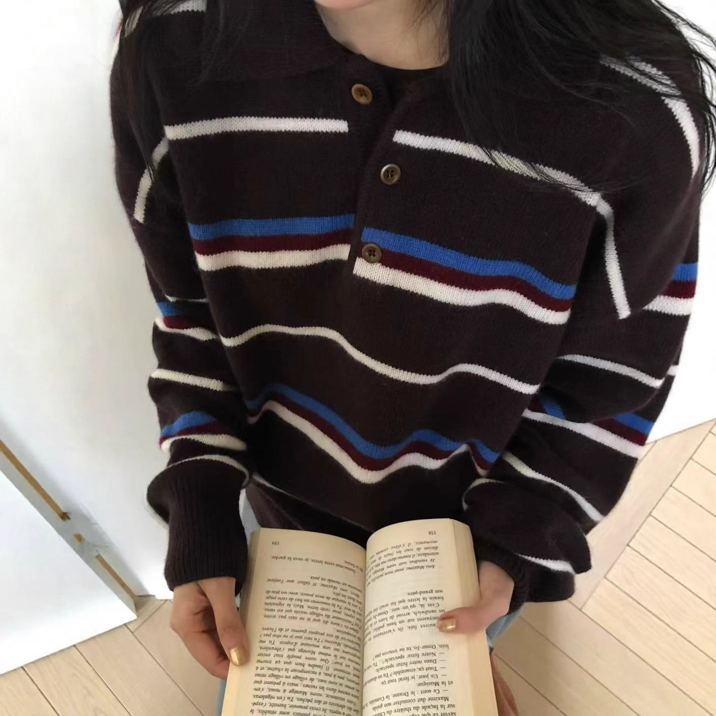 2025首批秋新款polo领条纹毛衣韩国宽松套头衣撞色外套女复古针织