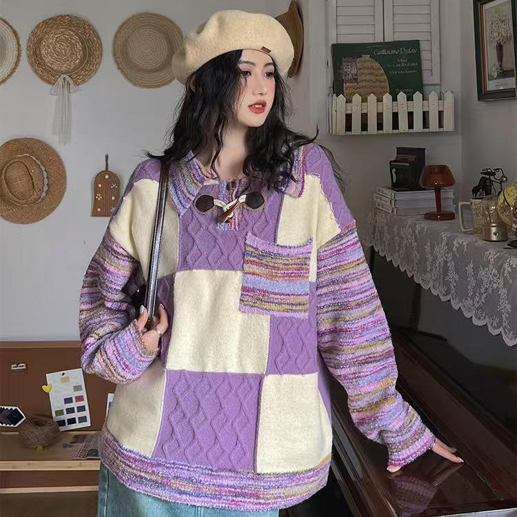 秋冬复古撞色套头毛衣女新款宽松软糯风大版翻领拼色针织衫上衣女