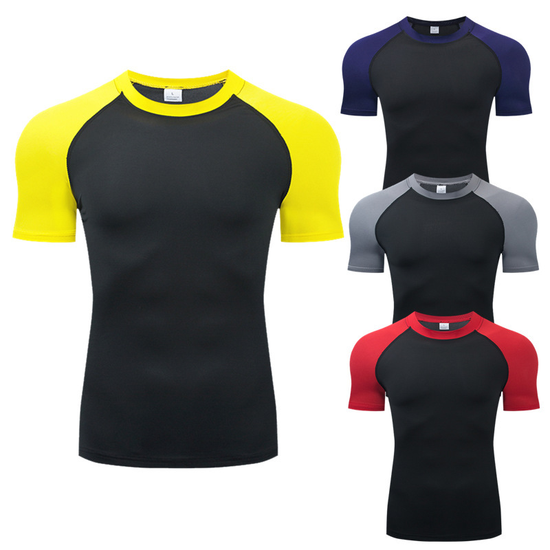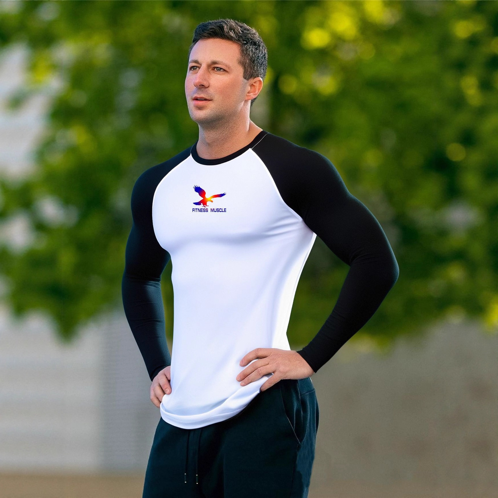 男士瑜伽长袖T恤弹力透气圆领健身运动T恤欧美时尚拼色袖子上衣