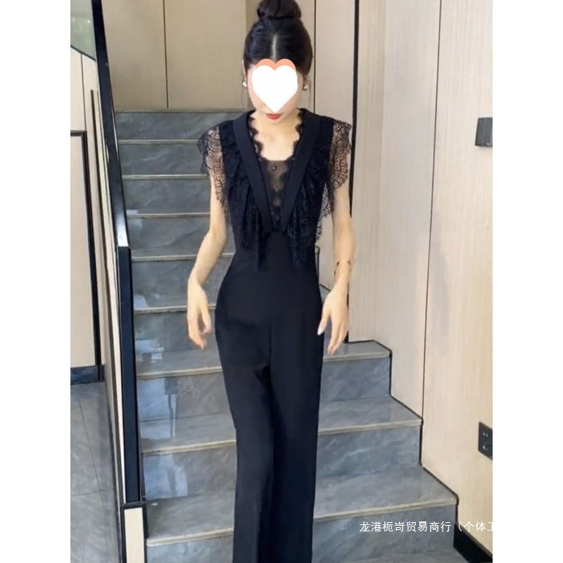 跨境跨境网红2025夏季新款时尚高腰显瘦气质蕾丝拼接连体衣阔腿裤