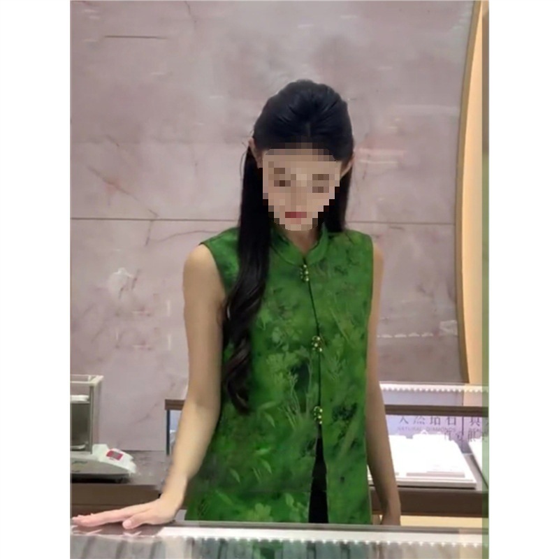 跨境OK-3026新中式复古重工绿色提花马甲上衣女夏季新款立领缎面