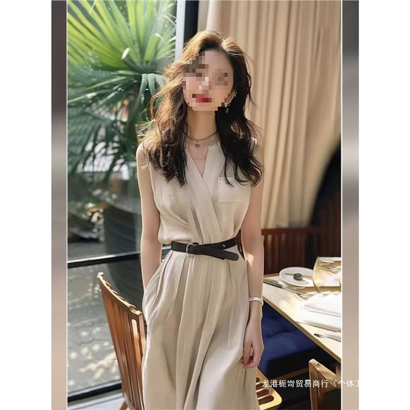 跨境2447法式无袖棉麻连衣裙女夏季新款超好看气质收腰裙子拼接中