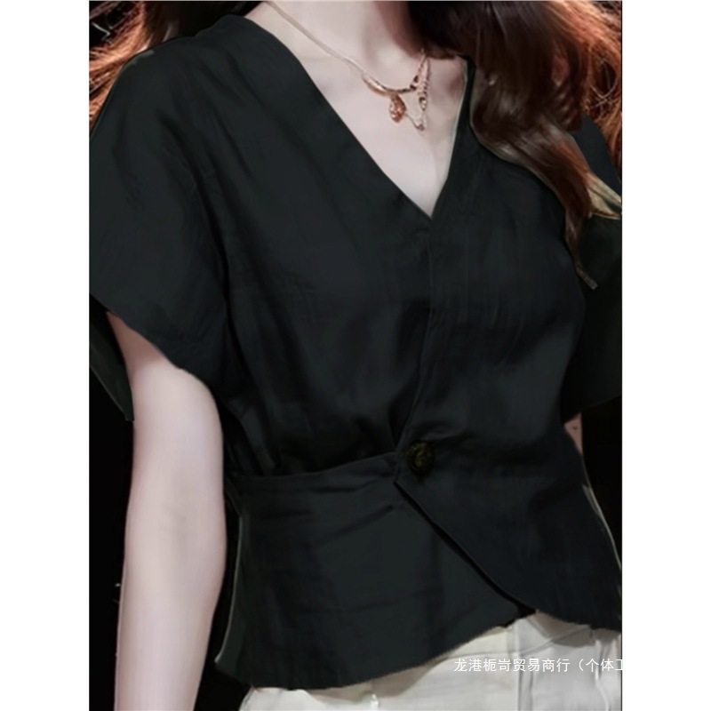 跨境2682黑色v领棉麻短袖衬衫女夏款新款轻奢感法式别致短款