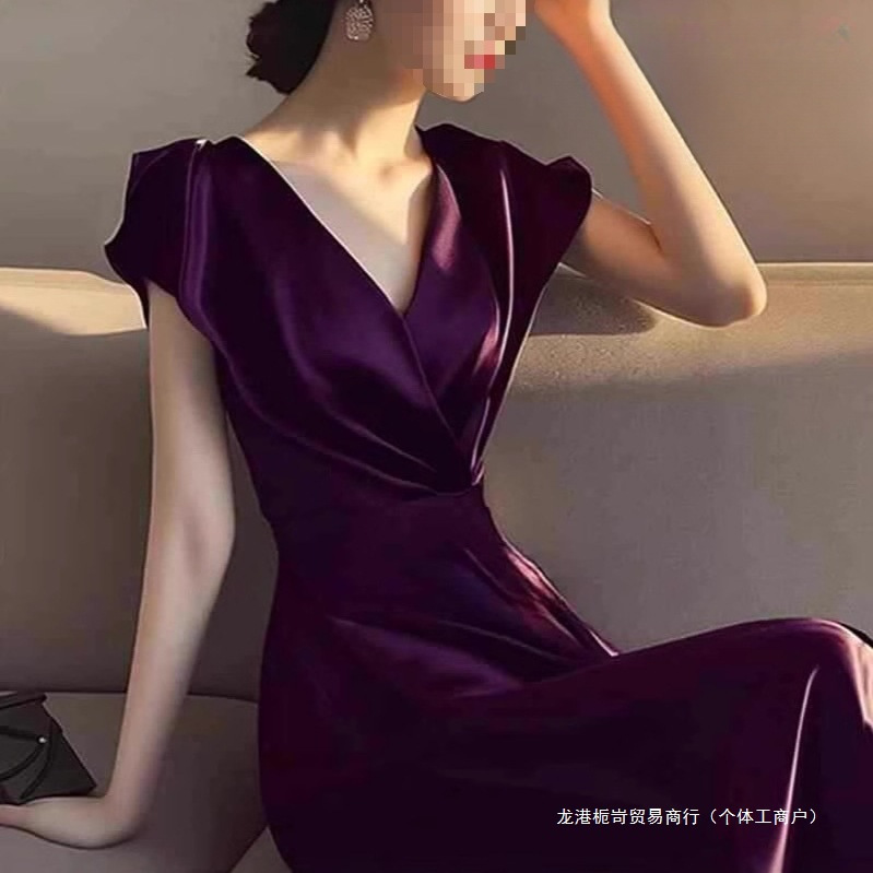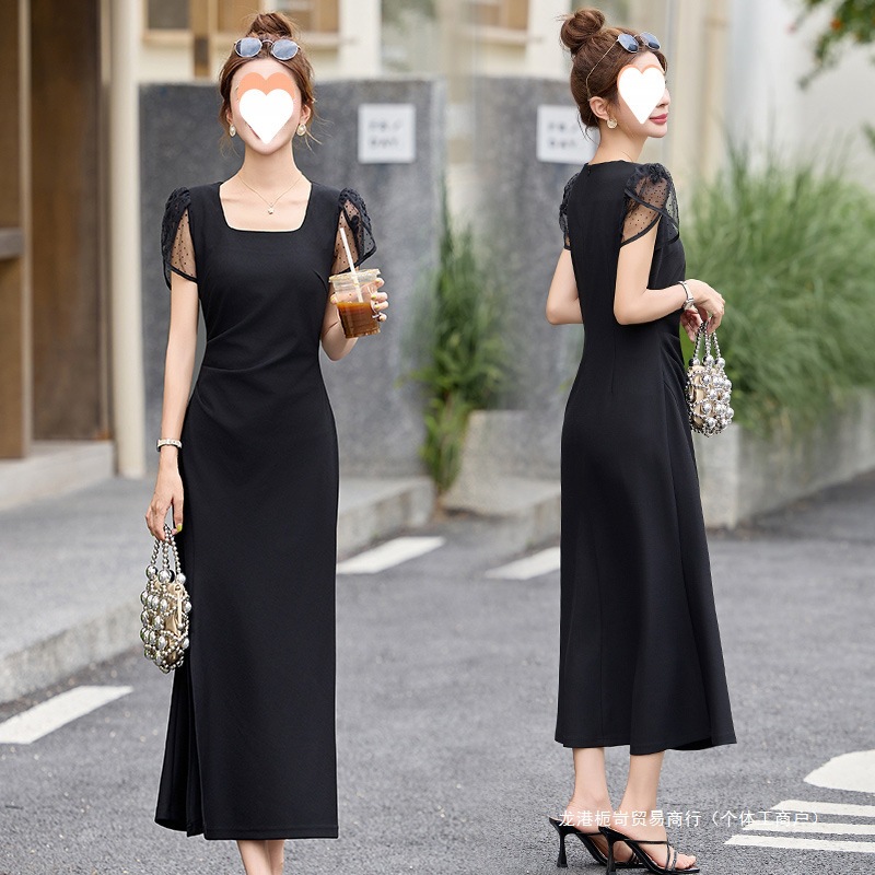 跨境FL240362正式场合感长裙赫本风名媛显瘦黑色短袖连衣裙子