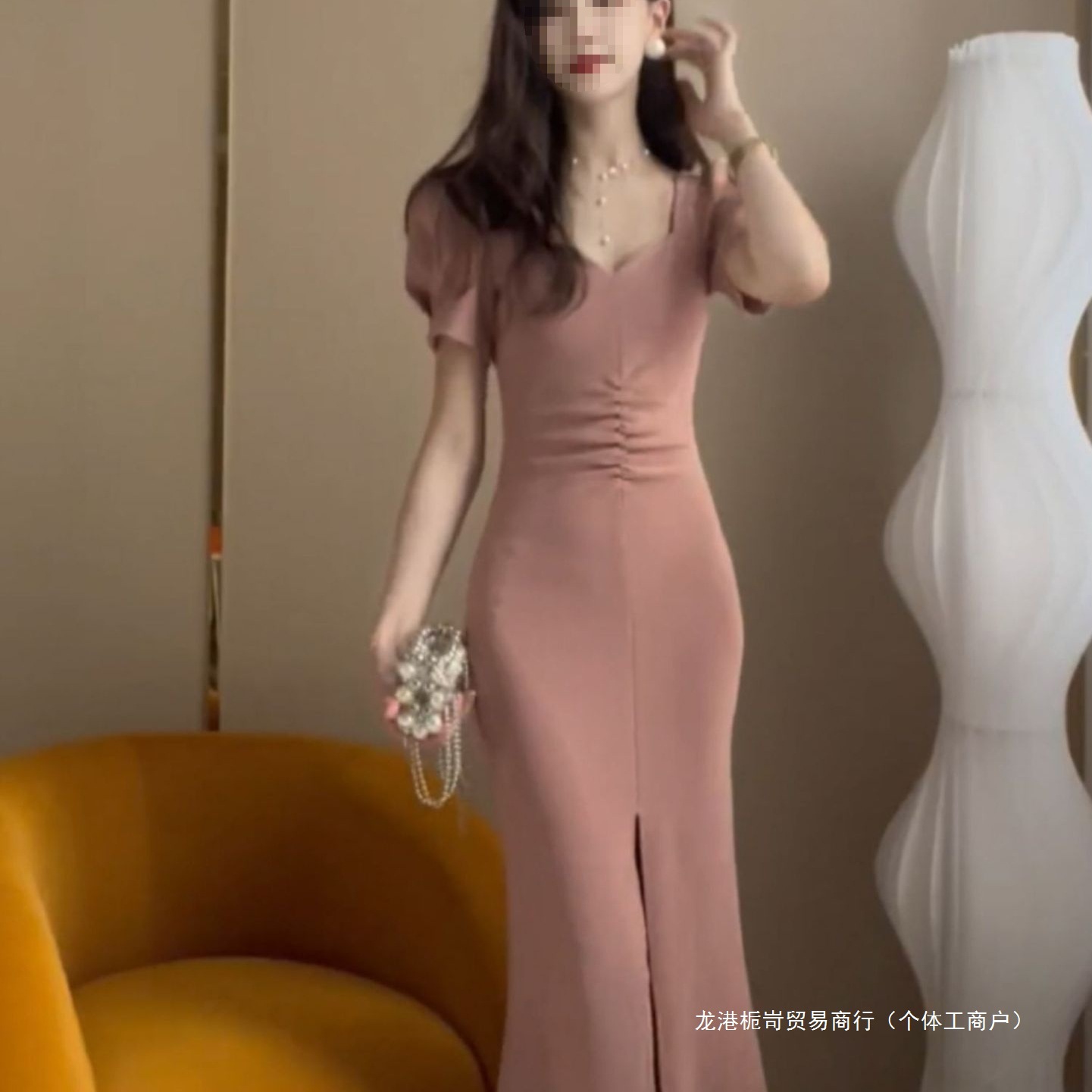跨境FL231633夏季高冷御姐收腰方领泡泡开衩连衣裙气质宴会晚礼服