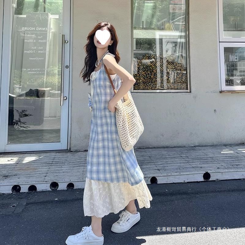 跨境超好看少女蓝色格纹吊带裙连衣裙新款夏季假两件拼接蓝色格子