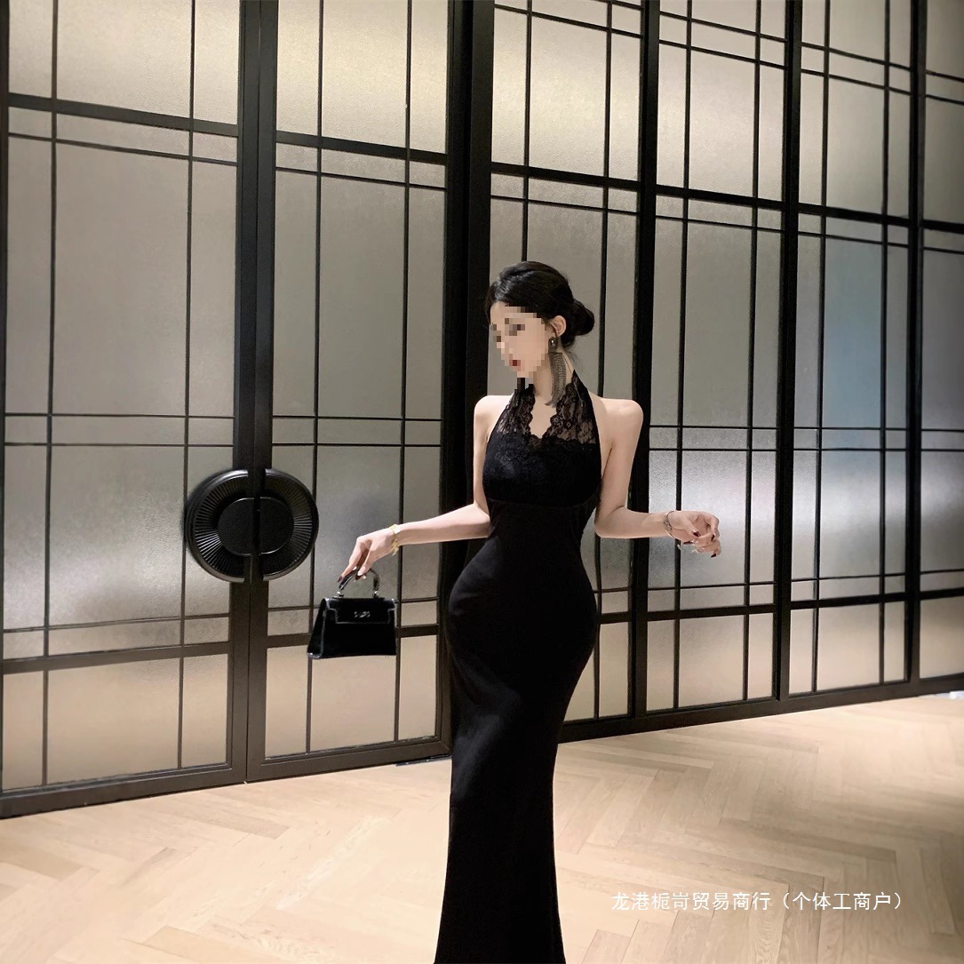 跨境8257气质蕾丝拼接V领挂脖丝绒长款黑色显瘦连衣裙生日聚会礼