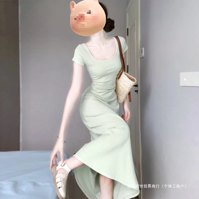 跨境法式温柔风露背绿色连衣裙子女夏季2025年新款小个子收腰气质