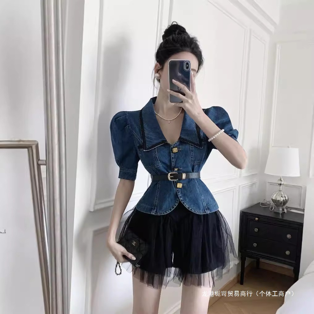 跨境4850跨境实拍新款时尚翻领牛仔外套配腰带+网纱裙防走光裤裙