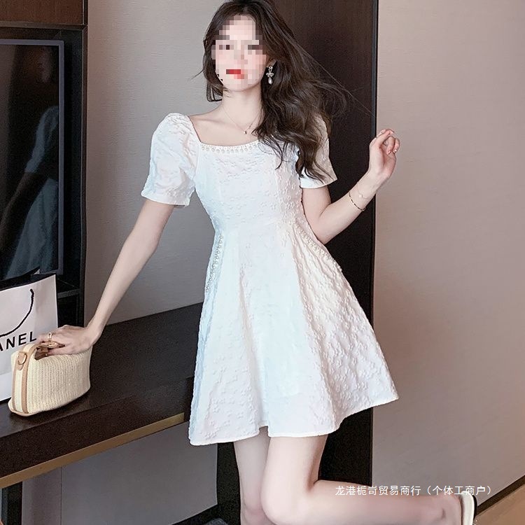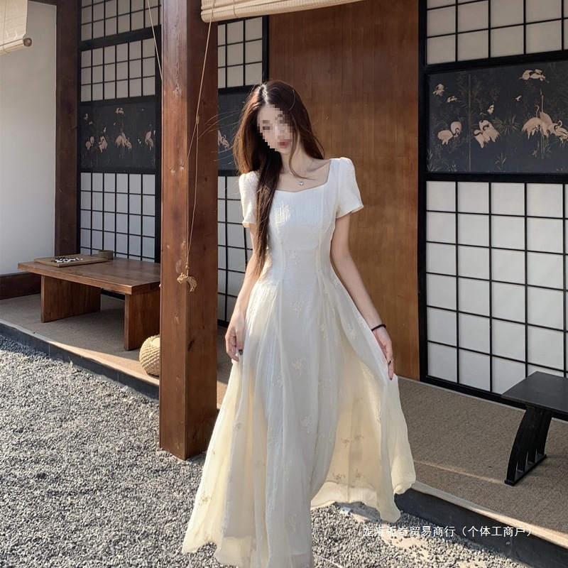 跨境气质方领白色连衣裙女夏季2025新款茶歇法式大方得体刺绣碎花