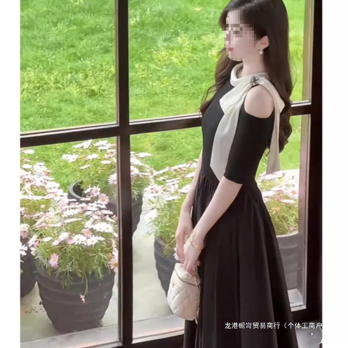 跨境2024夏时尚中袖法式收腰显瘦露肩连衣裙女长款蝴蝶结赫本风小