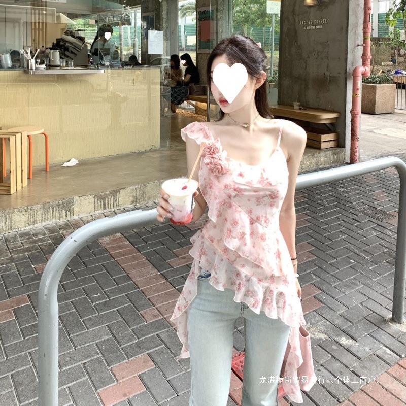跨境【4.6万人收藏】2025夏季新款两色不规则碎花辣妹飘带荷叶边