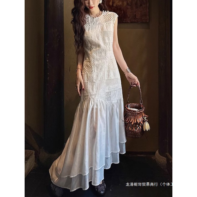 跨境连衣裙子新今年流行初夏穿搭漂亮掐腰裙藏青玉白棉镂空长