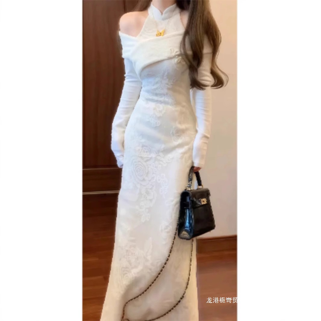 跨境白玉牡丹新中式国风露肩改良旗袍针织连衣裙收腰气质礼服长裙
