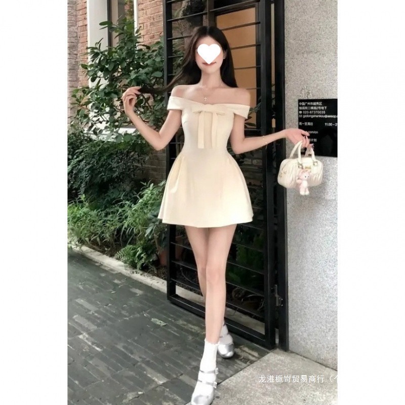 跨境云柔漫步 设计感蝴蝶结一字肩连衣裙女夏季新款收腰显瘦字短