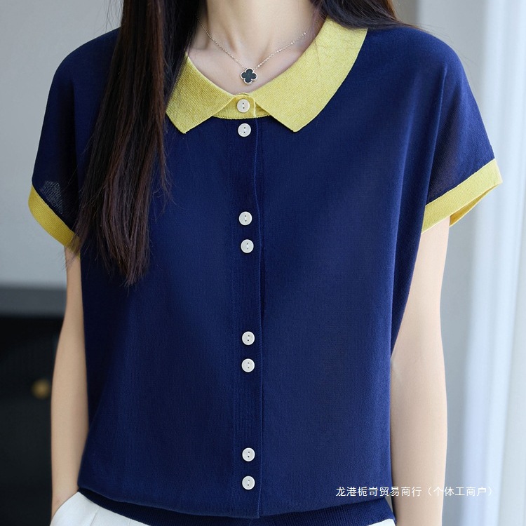 跨境重磅天丝双扣撞色翻领小飞袖开衫t恤女夏季薄款短袖打底外搭