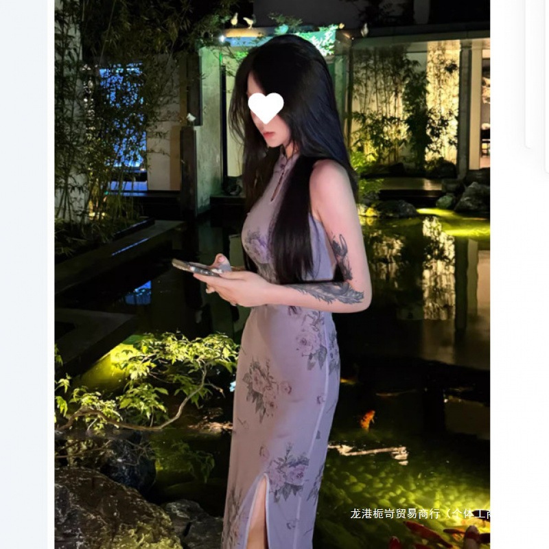 跨境紫棠丁香新中式印花镂空改良旗袍裙女复古温柔风设计感小众开