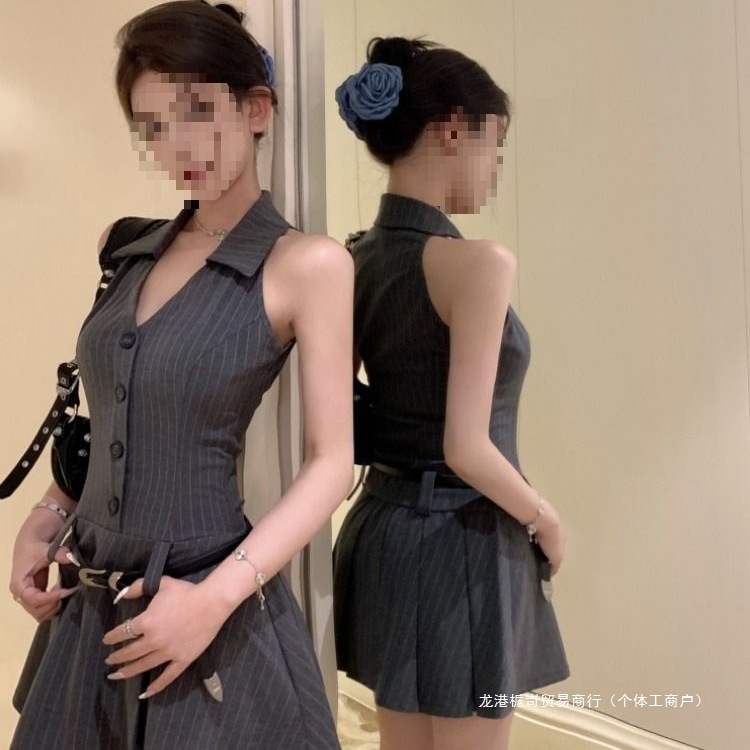 跨境复古灰色翻领挂脖连衣裙女装夏季学院风西装百褶裙无袖收腰短