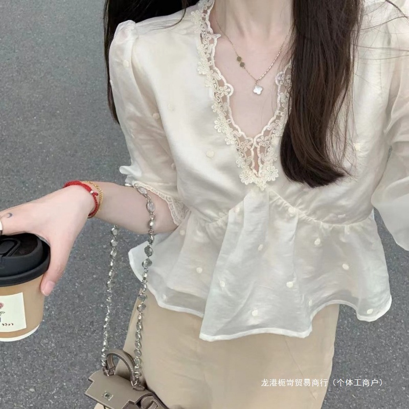 跨境法式v领短袖衬衫女夏季设计感小个子别致衬衣短款娃娃衫上衣