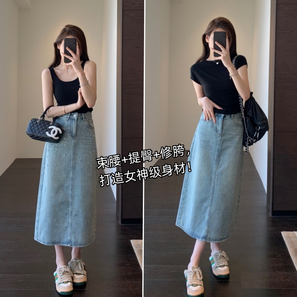 高级感烫钻牛仔半身裙显腿长高腰A字开叉长半身裙女2025春夏新款