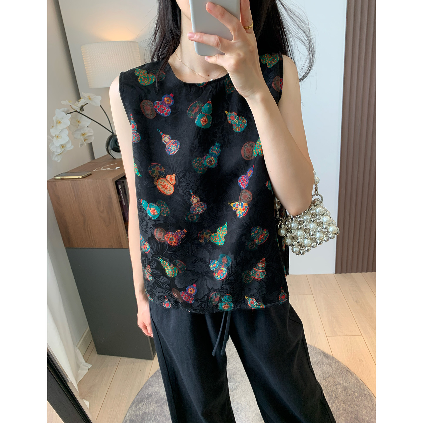 新中式老钱风~25姆米真丝花萝红云纱双面穿马甲/斜襟旗袍小衫上衣