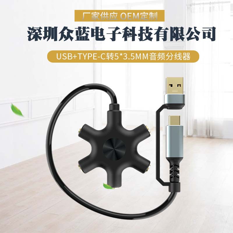 二拖五音频拓展一分五USB+TYPE-C转5*3.5MM 音频分线器耳机音箱