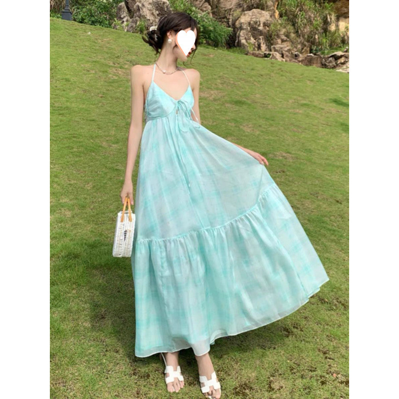 三亚沙滩度假连衣裙女蓝色度假裙海边沙滩吊带裙性感露背长裙夏