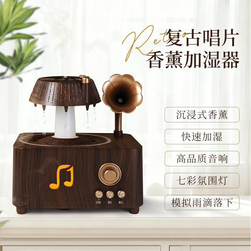 跨境热销复古唱片旋转水滴香薰机桌面蓝牙音响加湿器精油喷雾机