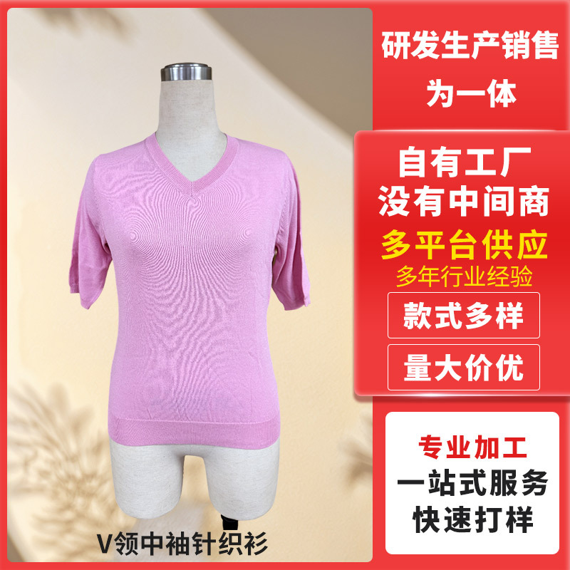 百搭V领针织短袖妈妈减龄漂亮洋气时尚纯色套头宽松垂感针织上衣