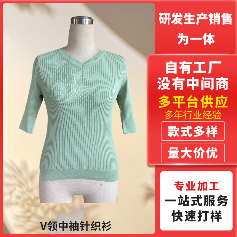 V领中袖针织衫夏季简约修身纯色打底螺纹显瘦舒适日系休闲百搭
